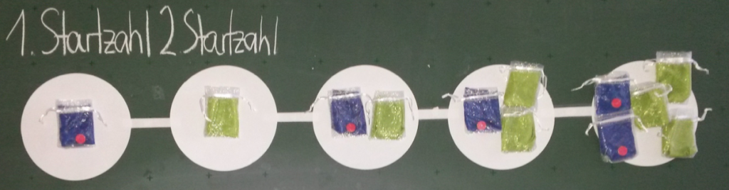 Eine weitere Möglichkeit wäre, den Kindern kleine Säckchen zu zeigen, in die man eine unbekannte Anzahl an Plättchen/Mugelsteinen/Perlen steckt. Und dann zu erläutern, dass das eine (blaue) Säckchen die erste Startzahl ist und das grüne Säckchen für die zweite Startzahl steht. Mit dem Auftrag „Versuche alle Zahlen der Zahlenkette mit den Säckchen für die beiden Startzahlen darzustellen.“