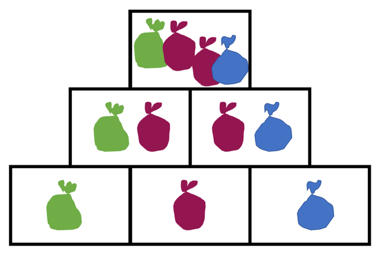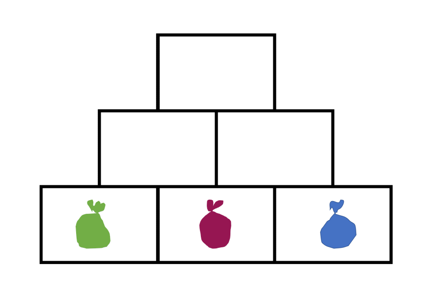 Warum erhöht sich die Summe im Deckstein sich um 2, wenn die Zahl im mittleren Basisstein um eins erhöht wird? Um diese mathematischen Strukturen besser veranschaulichen zu können, stellen Sie sich vor, Sie haben ein grünes Säckchen, in welches Sie eine beliebige Anzahl an Plättchen packen können. Dieses legen Sie in den unteren linken Basisstein. Ein rotes Säckchen nehmen Sie für den mittleren Stein und einen blauen für den rechten.