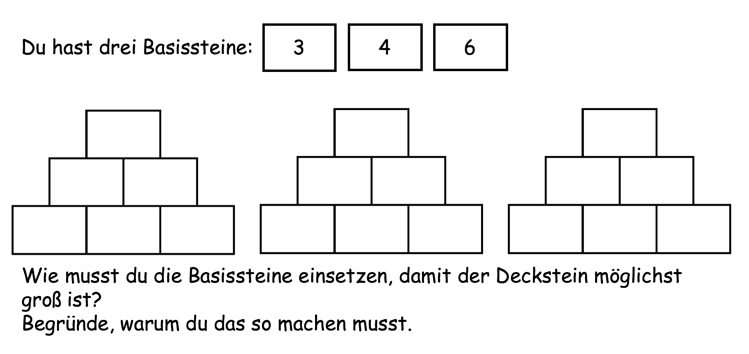Man erkennt an beiden Darstellungen, dass der mittlere Basisstein zweimal in der Summe des Decksteins enthalten ist. Wird also der mittlere Basisstein um eins erhöht, erhöht sich die Summe im Deckstein um 2 – da der mittlere Basisstein sich zweifach auf den Deckstein auswirkt. Solche Entdeckungen können die Kinder – sicherlich aber auf ihrem Niveau und nicht mit Variablen – sehr gut tätigen, wenn sie dazu angeleitet werden.