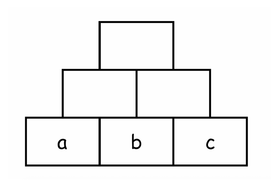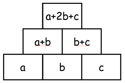 Dieser Zusammenhang wird ebenfalls deutlich, wenn man sich die algebraische Struktur einer Zahlenmauer ansieht. Dazu nutzt man nun – anstelle der Säckchen – Variablen, sprich a, b und c.