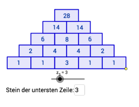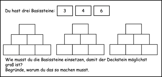 Durch die Variation der Basissteine sollen die Kinder dazu angeleitet werden, zu erkennen, dass die größte Zahl im mittleren Bassisstein stehen muss, um die größte Zahl im Deckstein zu haben. Die beiden äußeren Basissteine können dabei aber vertauscht werden, da beide einmal in den Deckstein eingehen und deren Position am Ergebnis nichts ändert.