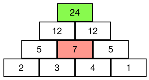 Bei einer 4er-Mauer ist die 2. Zeile (von unten) komplett vorgegeben. Welche Werte können die restlichen Steine tragen, wenn die beiden unteren Randsteine gleich groß sein sollen? Was fällt auf?