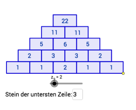 Wie verändern sich eigentlich die Werte in einer Zahlenmauer, wenn man einen Basisstein verändert? Mit der folgenden Animation können Sie dem Zusammenhang auf den Grund gehen. Wenn Sie den grauen Schieberegler bewegen, erhöht sich der erste Basisstein analog um 1. Die übrigen Steine werden automatisch berechnet. In dem Kasten können Sie eingeben, welchen der Basissteine Sie verändern möchten. Welche Auswirkungen hat die Veränderung des linken Basissteins auf den Wert im Deckstein? Wie verändert sich der Wert im Deckstein, wenn sich der mittlere Basisstein um eins erhöht? Wie lassen sich mögliche Unterschiede erklären?