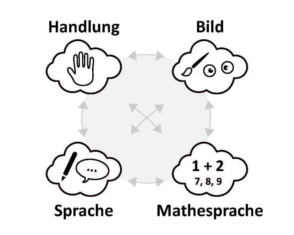 Zur Einsicht in Melissas Fehler – so wie auch in viele andere Fehler - ist es daher ratsam, von Melissa sogenannte Darstellungswechsel zu fordern und zu fördern. Dadurch kann Melissa verstehen lernen, was es bedeutet zu subtrahieren. Bei einemDarstellungswechsel (Pfeile in der Abb.) können die Kinder Wechsel zwischen den Darstellungsformen (Handlung, Bild, Sprache und Mathesprache) vollziehen.