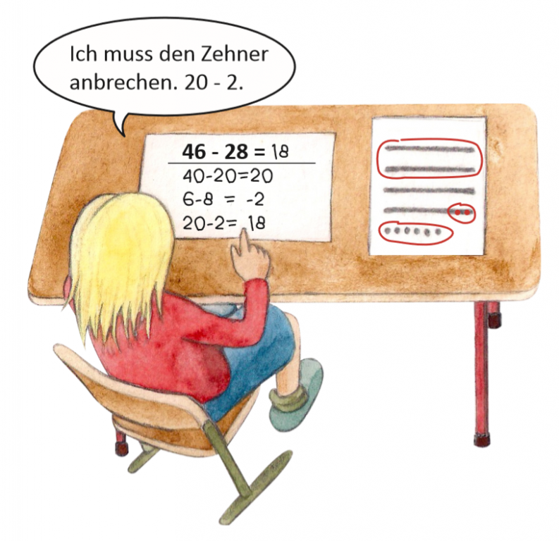 Mit Melissa könnte die Aufgabe „46-28“ handelnd oder zeichnerisch im Bild (siehe Abbildung) nachvollzogen werden. Dabei sollte dieses Vorgehen unbedingt auch sprachlich begleitet werden: „Warum passt die Zeichnung zur Aufgabe? Wo siehst du 40-20? Wo siehst du 6-8?...“. Die Problematik des ‚Abziehens vom kleineren Einer‘ kann insofern gelöst werden, dass mit dem Kind vereinbart wird, es schreibt ein Minuszeichen vor das Zwischenergebnis und merkt sich dann, dass dafür der nächste Zehner „angebrochen“ werden muss.