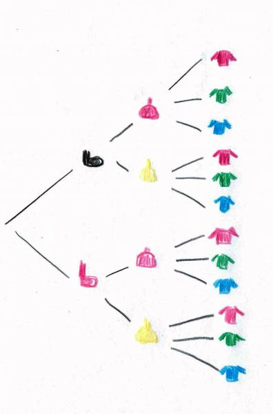 Als weiteren Weg zur Ermittlung der Gesamtzahl möchten wir die Nutzung von Baumdiagrammen beispielhaft darstellen. Ein typisches kombinatorisches Problem, das bereits im Anfangsunterricht genutzt wird, ist eine Anziehaufgabe. Fachwissenschaftlich ist eine derartige Aufgaben eine Permutation ohne Wiederholung.