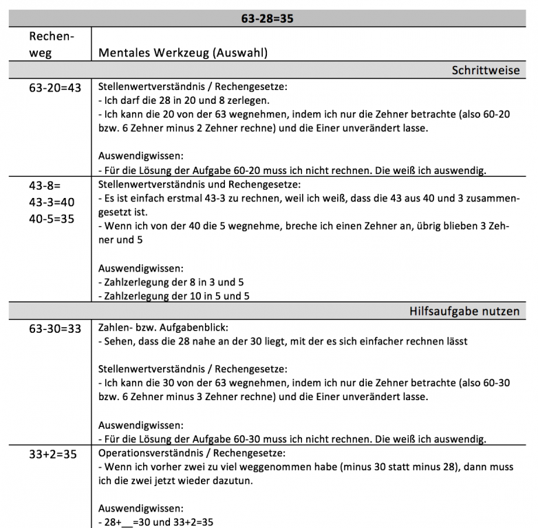 Auch Sie werden beim Lösen der Aufgabe 63-28 mentales Werkzeug genutzt haben und finden vielleicht in den oben genannten Beispielen „Bestandteile“ Ihres Lösungsweges wieder und können jetzt ein bisschen genauer erkennen, was genau beim Rechnen in Ihrem Kopf vorgegangen ist.