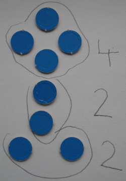 So kann so eine konstruktive Fehler- und Gesprächskultur etabliert werden: Ergebnisse sind nachrangig, wenn die Begründung nachvollziehbar ist („Sehr gut, du hast also acht gesehen, weil du drei und fünf gesehen hast.“). Hinzu kommt, dass gut nachvollziehbaren Beschreibungen im Nachhinein nicht geschmälert werden, wenn die beschriebene Menge nicht mit dem Gezeigten übereinstimmt.