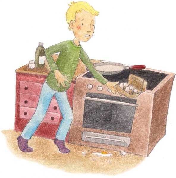 Torben möchte sechs Eier zum Frühstück machen. Ein Ei fällt ihm auf den Boden. Wie viele Eier kann er jetzt noch machen?