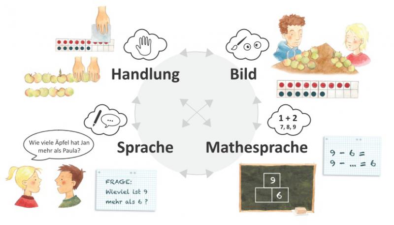 Vermutlich haben Sie die Übersetzungen zwischen den verschiedenen Darstellungsformen bereits verinnerlicht, gar "automatisiert" und nehmen diese gar nicht mehr so bewusst wahr. Dem Kind sind diese für uns "einfachen" Darstellungswechsel keinesfalls unmittelbar klar und stellen eine große Herausforderung dar. Denn für das Kind ist es ein Unterschied, ob eine Aufgabe als konkrete Sachsituation, als Bild oder symbolisch als Rechenaufgabe vorliegt.