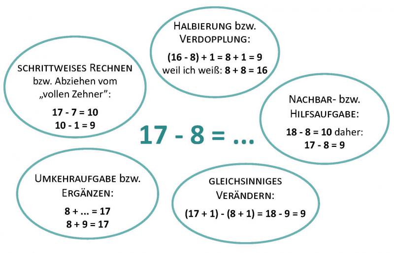Kinder sollten die Ergebnisse der Minusaufgaben sicher mit Hilfe der Beziehung zu den entsprechenden Plusaufgaben und anderen halbschriftlichen Rechenstrategien ableiten können.