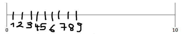 Lea wurde die Aufgabe gestellt, die Zahlen auf einem Zahlenstrahl einzutragen (Abb. 2). Auf den ersten Blick ist zu erkennen, dass ihr dies noch nicht gelingt. Sie zeigt noch große Schwierigkeiten beim Eintragen der Zahlen im Zahlenraum bis Zehn. Lea macht zwar schon viel richtig, trotzdem scheint sie die Relationen auf dem Zahlenstrahl noch nicht in den Blick zu nehmen. Sie hält die Reihenfolge der Zahlen korrekt ein und auch die Abstände zwischen den Zahlen sind (fast) gleich groß. Lediglich der Abstand zwischen der 9 und 10 ist zu groß.